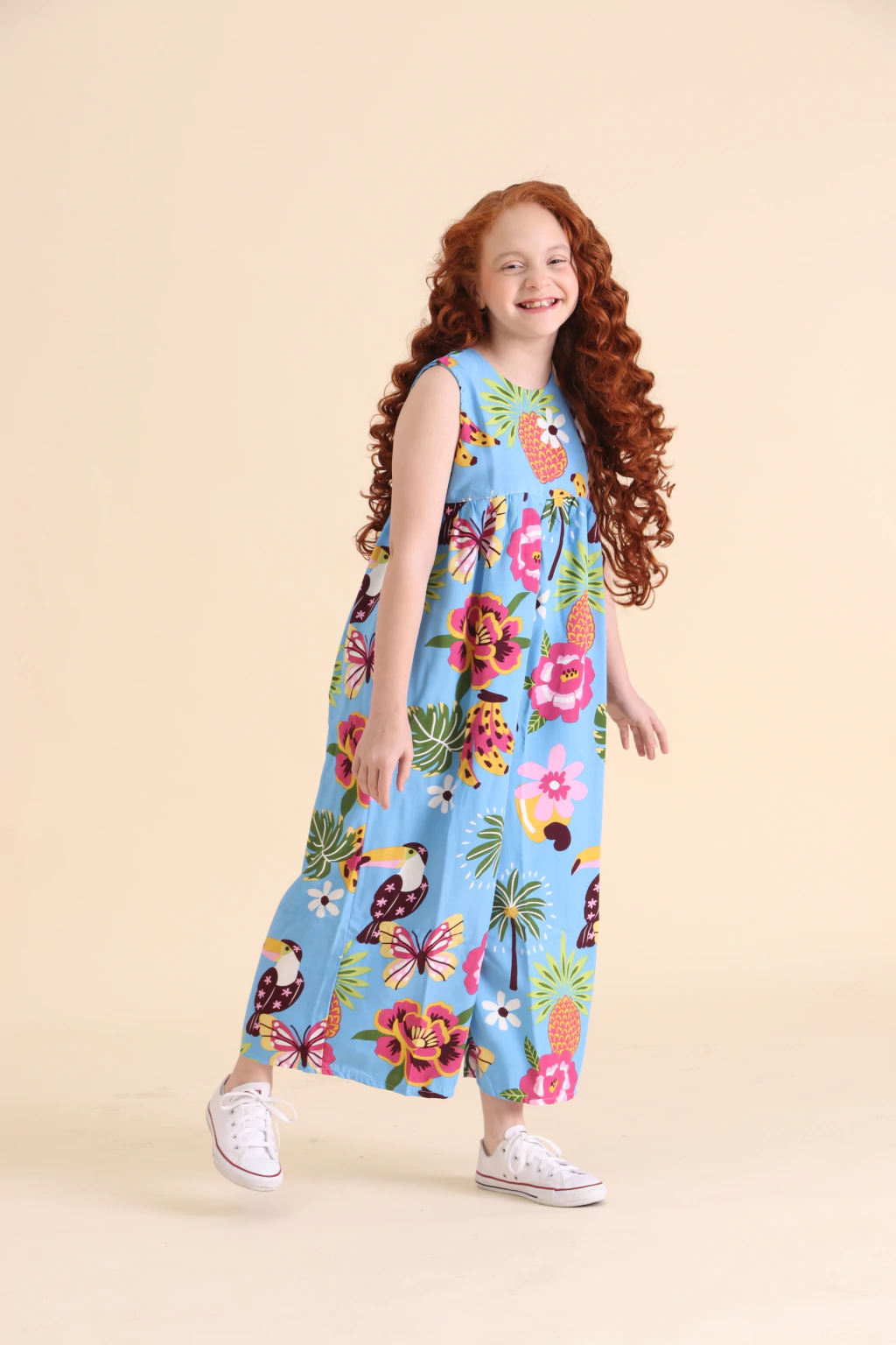 Macacão regata, barra ampla pantacurt e zíper nas costas...